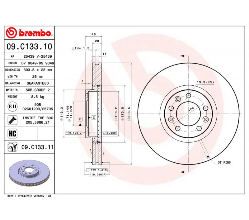 Brembo Disco de freno Delantero 09.C133.11
